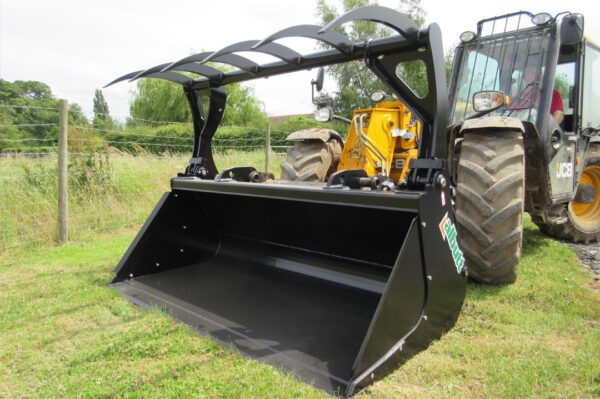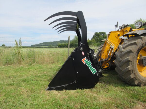 Albutt bucket grabs are a versatile attachment for material handling in agriculture. Offering the features of a bucket and fork grab in one attachment. The bucket features bolted sides which can be removed for muck handling etc. The wide opening grab features Hardox high tensile steel tines which are welded into a thick walled tube, providing high strength and long term reliability. The bucket edge can touch a vertical face with the grab open, allowing corners in buildings to be cleared. This new attachment is suitable for use with telehandlers and loaders.
